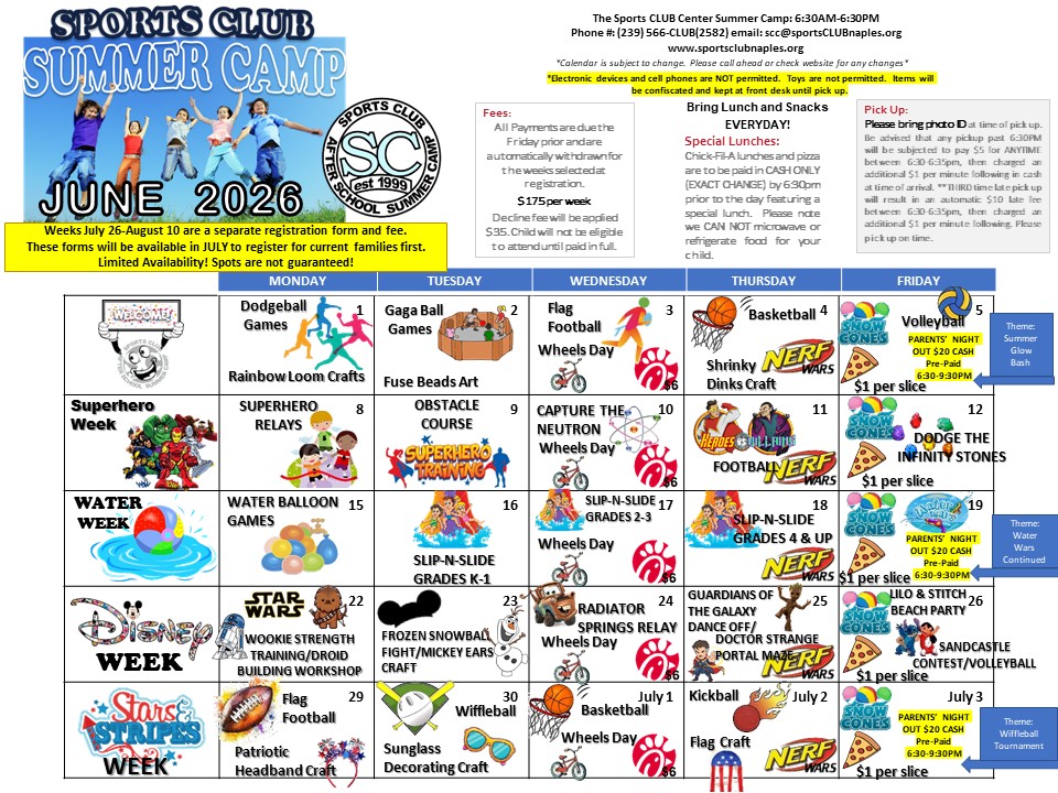 Registration will be offered during in July by email with a link to register online. For those weeks due to limited availability, there is an increase in price. We will only be open at The Sports CLUB Center.